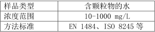 这些样品中通常会带有大量的不溶颗粒物,如沉淀物。在TOC测试时需要被计算进去。国际标准 EN 1484 和 ISO 8245 提供了一种方法去验证不完全溶解样品成分(颗粒物<100μm)的均质化和回收,也称为“回收率测试”。